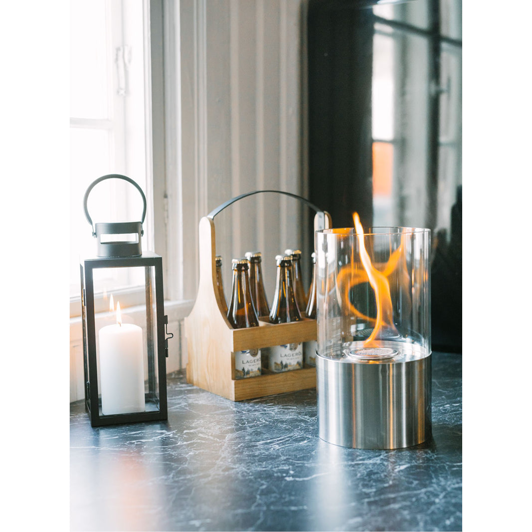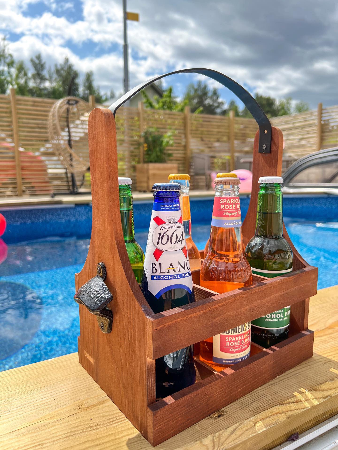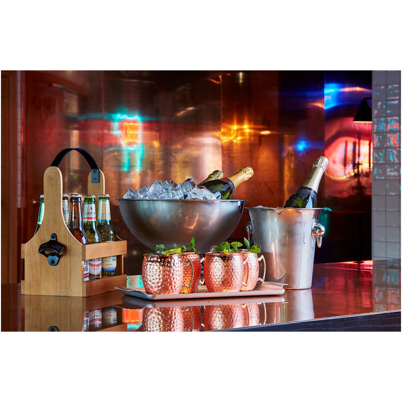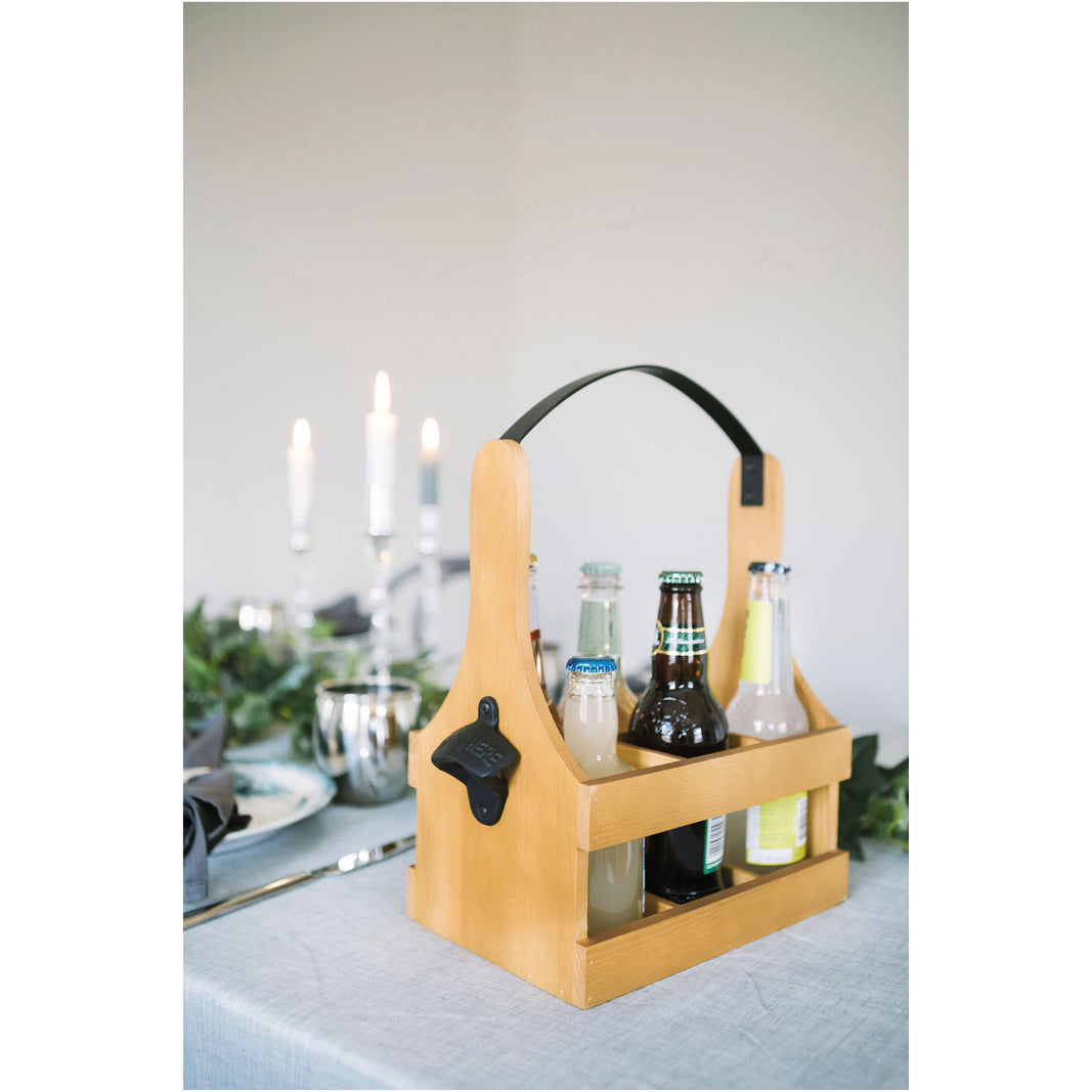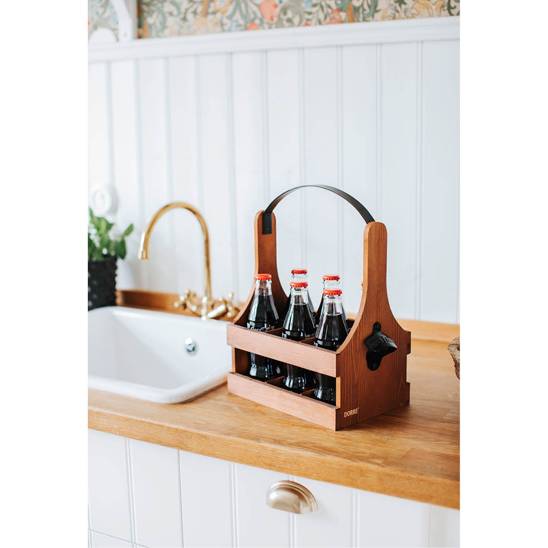 Servera dricka och alkoholhaltiga drycker på ett riktigt snyggt sätt med flaskbacken Tage. Flaskbacken är tillverkad i trä med ett smideshandtag och den rymmer sex dryckesflaskor. Du bestämmer själv vilka drycker du vill placera i flaskbacken.