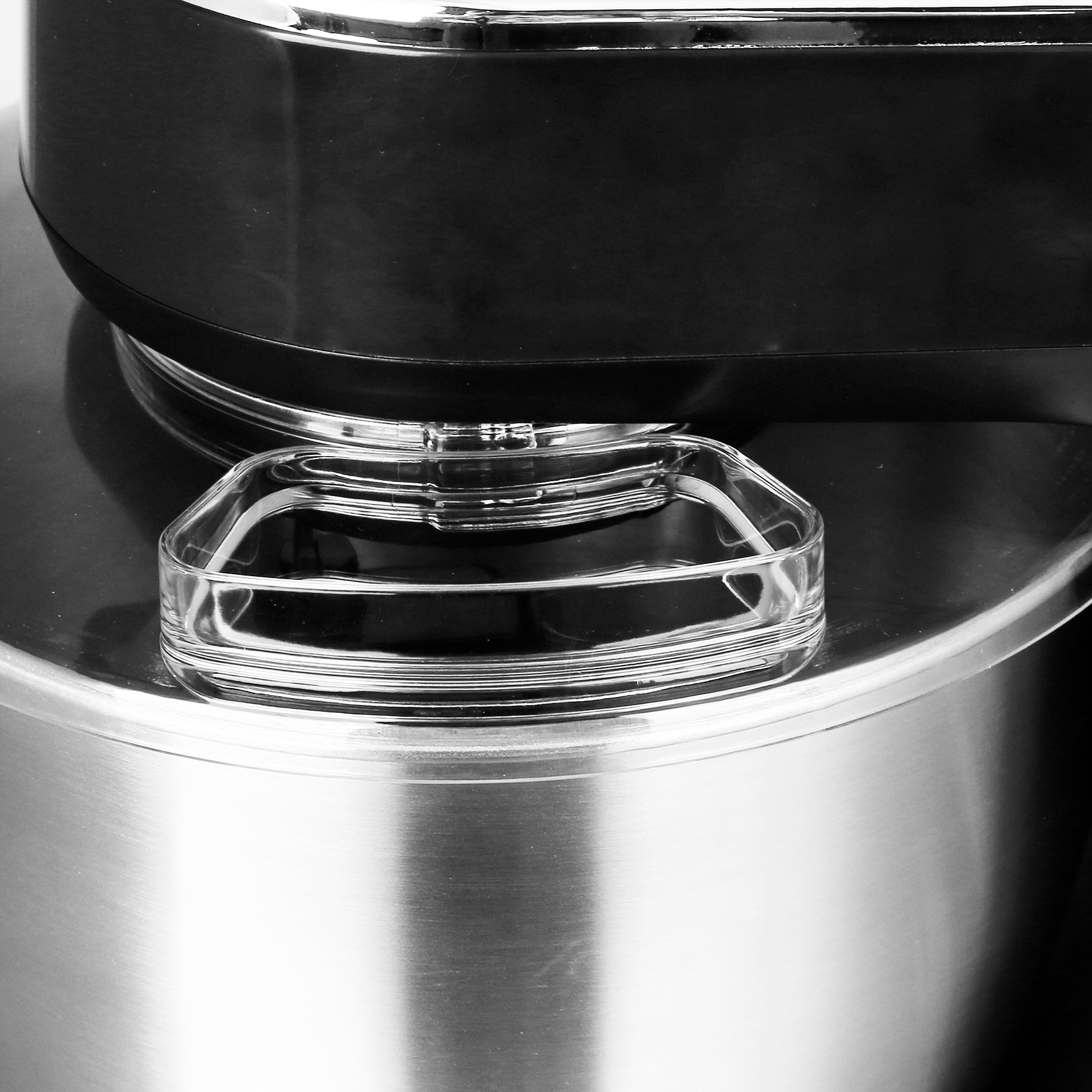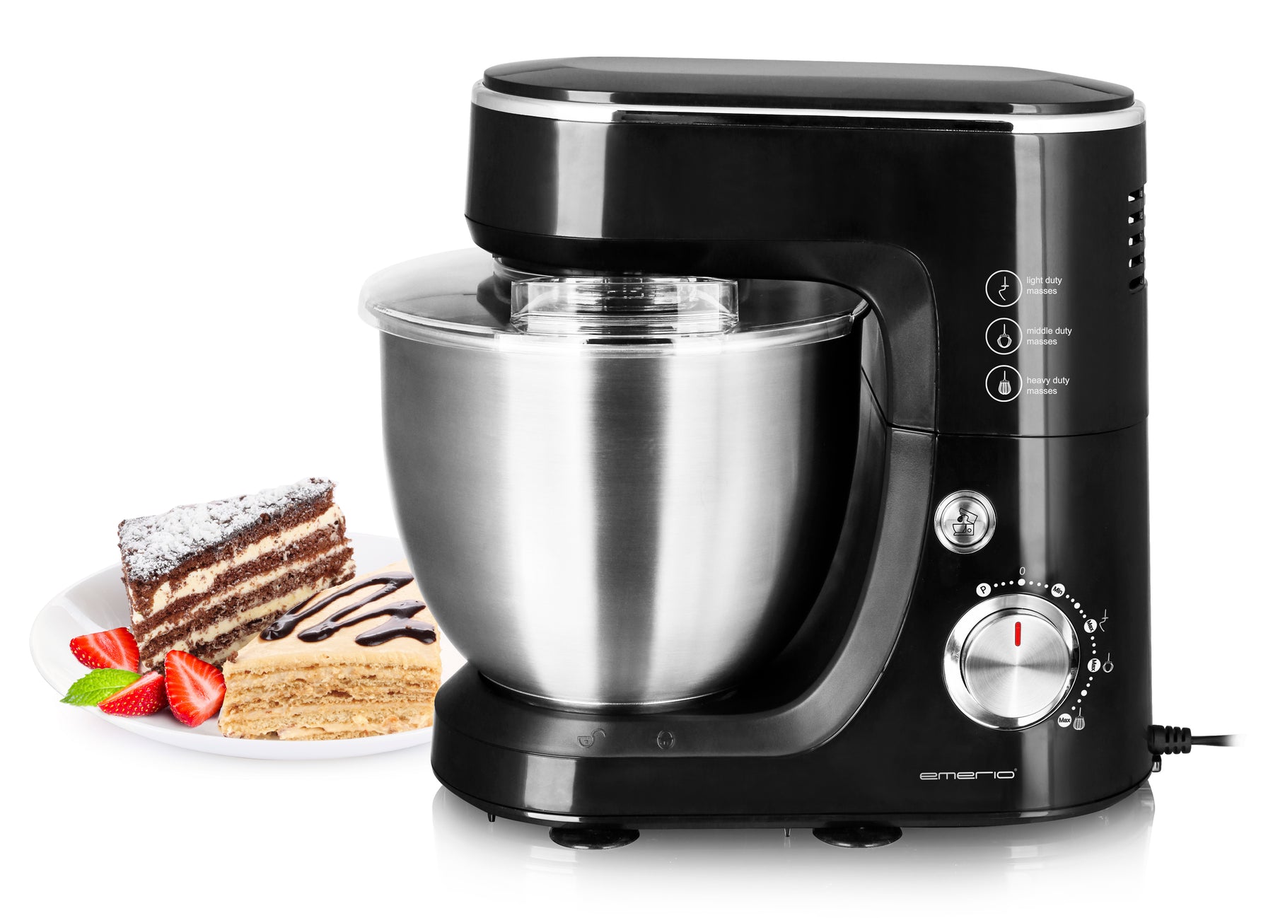 Den medföljande rostfria bunken är både slitstark och tål maskindisk, vilket gör rengöringen extra smidig. Du får även med degkrok, vispar och ballongvisp – perfekt för varierad bakning. Tack vare halkskyddade fötter står maskinen stadigt även vid hög belastning.