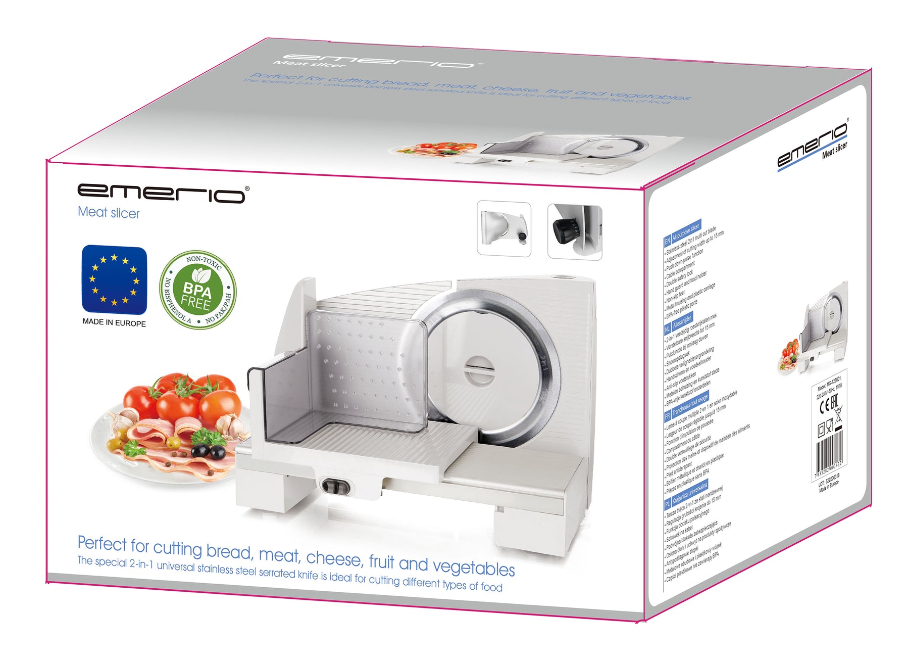 Emerios skärmaskin är det perfekta verktyget för dig som vill skiva bröd, ost, chark eller grönsaker med exakthet. Det rostfria stålbladet med en diameter på 165 mm ger jämna snitt, och den justerbara skärtjockleken från 0 till 15 mm låter dig anpassa varje skiva efter behov. Utrustad med löstagbara knivar för enkel rengöring, säker på/av-brytare samt matpåskjutare med tumskydd för trygg användning. Antiglidfötter och praktisk sladdförvaring gör den både stabil och smidig att förvara i köket.